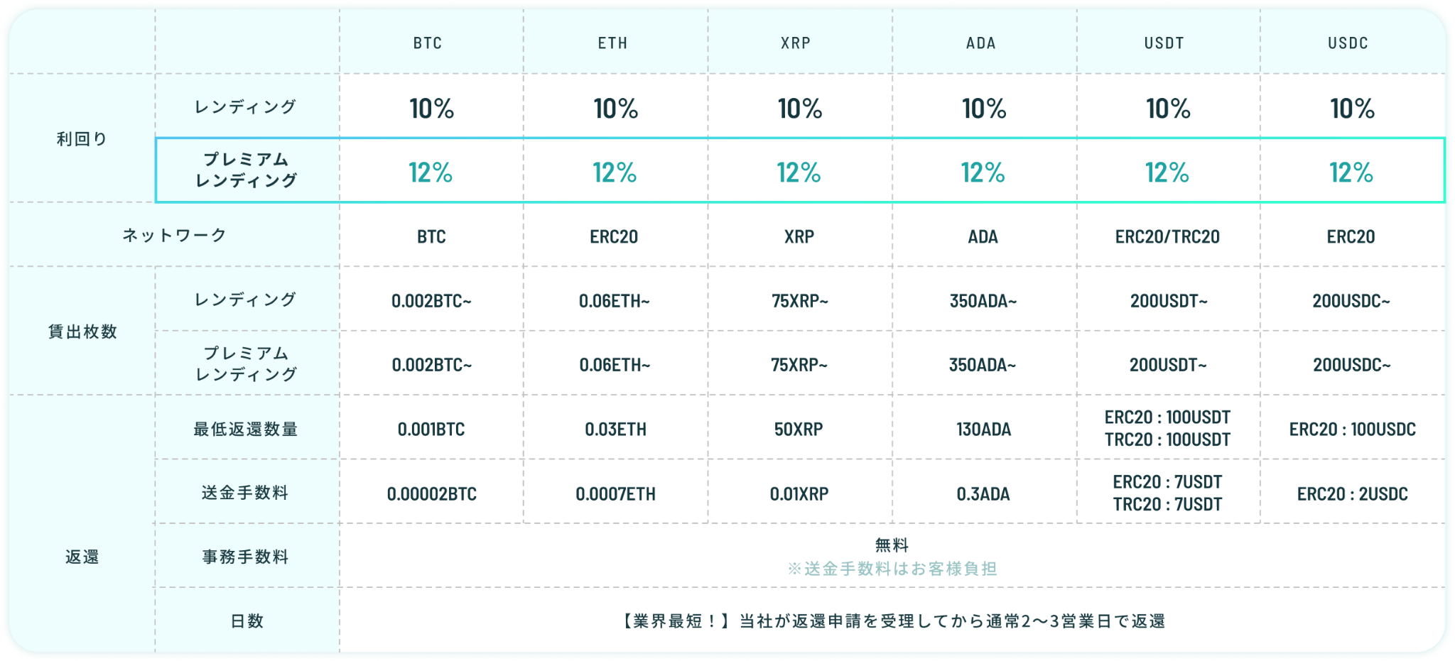 通常レンディングは年利10%、プレミアムレンディングは年利12%を暗号資産数量ベースで固定(単利)しています。返還時の暗号資産価格が下落している場合は円換算で元本割れとなる可能性があり、元本保証はありません。価格変動リスクを十分ご理解のうえご利用ください。